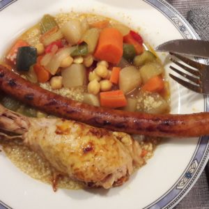 Cette recette traditionnelle me vient d'une amie marocaine. Il s'agit d'une version rapide, adaptée à notre vie de femme/maman pressée. Pour les viandes, c'est au choix. Ici, j'ai choisi du poulet et des merguez.